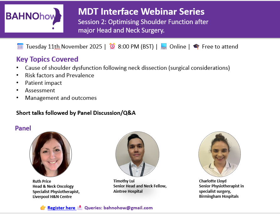 nd Neck Oncology Specialist Physiotherapist, Liverpool Head and Neck Centre. Timothy Liu, Oral and Maxillofacial Surgeon, Fellow at Aintree University Hospital. Charlotte Lloyd, Senior Physiotherapist, University Hospitals Birmingham.