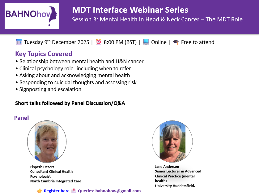 News ArticlesMeetings & EventsSubmit EventBAHNO Webinars and recordings Home News & Events Meetings & Events Session 3: Mental Health in Head & Neck Cancer 9 December 2025 8:00PM – 9:00PM Download Event to Calendar Event Panel Members: Elspeth Desert, Consultant Clinical Health Psychologist, North Cumbria Integrated Care. Jane Anderson, Senior Lecturer in Advanced Clinical Practice, University of Huddersfield. Link to Register: Click here ← Other meetings & events